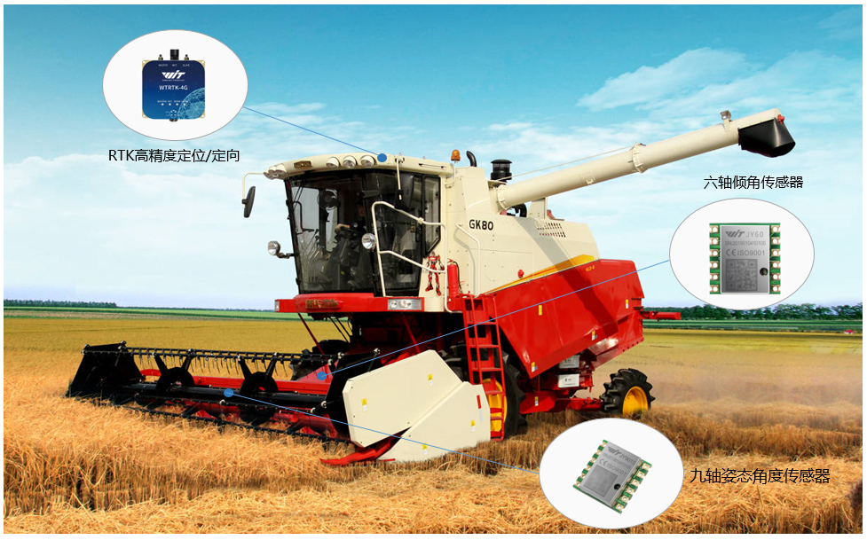 维特姿态传感器通过检测农机不同的倾角变化,在农机深耕、收割、播种等功能中实时监测,使农机更平稳运行。除此外,维特智能倾角传感器满足农机耕地的使用要求,可实现农机自动导航技术工作时倾角的变化和对工作装置的可调角度的测量,然后把测量的前后倾斜角度进行相应的数学运算,便可以计算出来上升或下降的位移量,使得农机无人驾驶运行更加的稳定方便安全。适用于农业收割、农业深松机、农业压地机等: